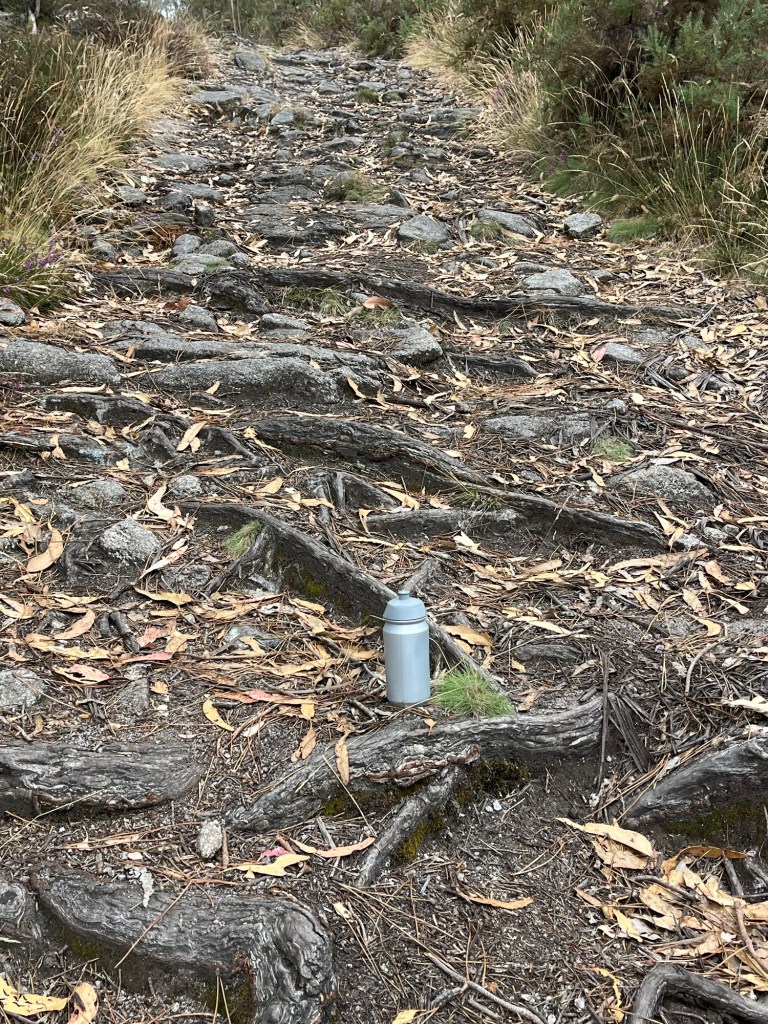 “A cantimplora segue aquí!”, di a miña amiga. Foron eles quen a atoparon e puxeron no medio do camiño, por se era dun ciclista e volvía recollela, pero non o fixo, así que a levamos con nós para que non quede alí.