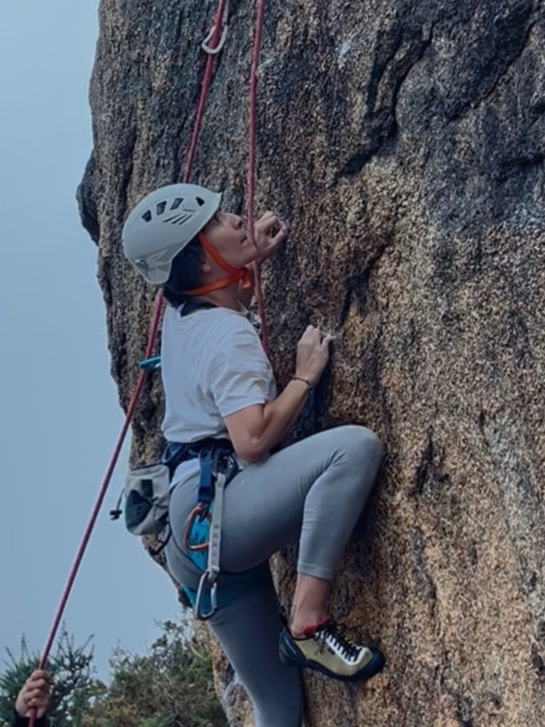 Facemos as primeiras liñas de maneira solta. O granito é un granito medio alaranxado e cheo de pitóns, e séntese seguro e agradable subir por el. Todo o agradable que é subir por unha parede de granito, claro. E todo o agradable que é subir por unha parede de granito cando levas varios días sen escalar. “Dóenme moito os dedos”, quéixase aos poucos outro dos amigos.