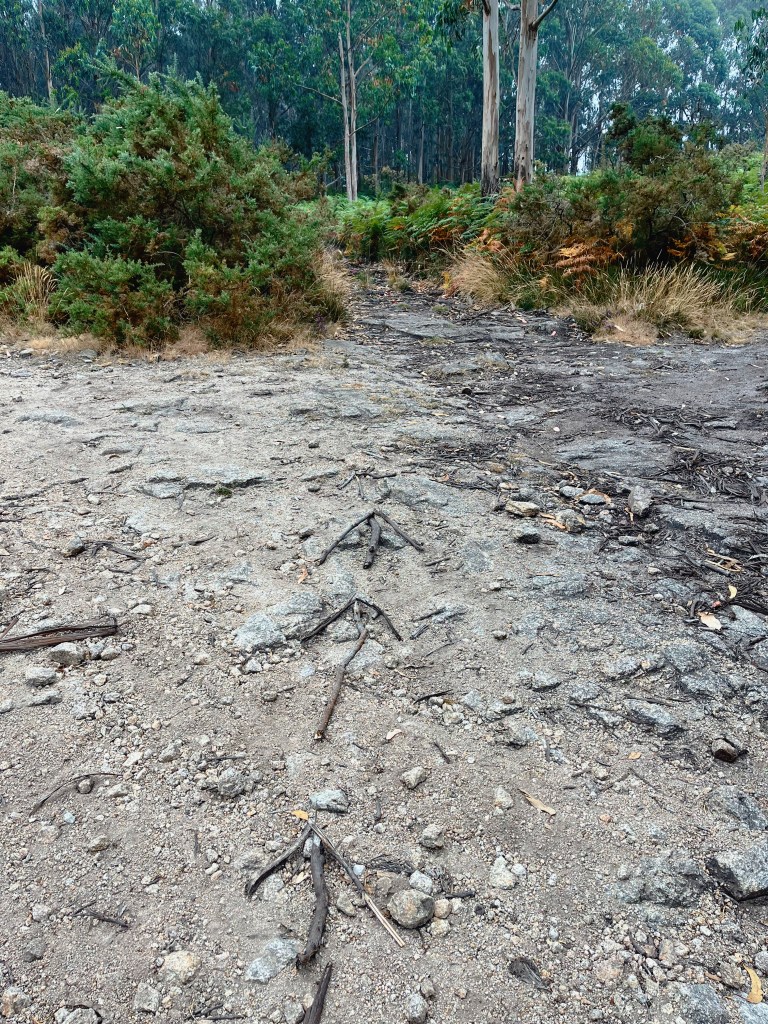 Saíndo da Coruña non parece que vaia ser posible. Case non se ve a dous metros de distancia e o ambiente é húmido, pero, coma case sempre, teñen razón. Eles chegan primeiro e como a aproximación é un pouco complexa mándanme un audio e explícanme que me deixaron sinais nos cruzamentos de camiños. Fitos con pedra e frechas con paus. O camiño que debo seguir, engaden, é o que queda xusto detrás dos seus coches.
